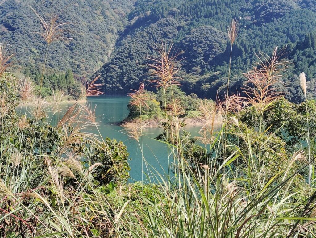 ススキの向こうには、ダム湖(一ツ瀬ダム)の湖面がキラリ。