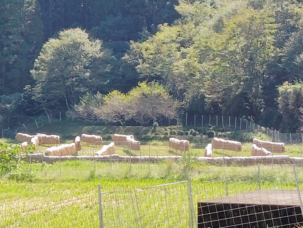 田んぼには、掛け干しされた稲が陽を浴びて黄金色に。