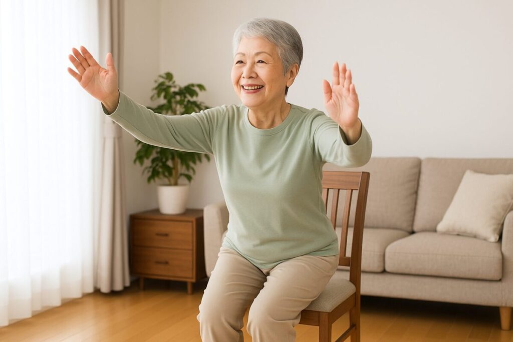 - イスに腰掛け、両手を上にあげながら、ゆっくり立ち上がる