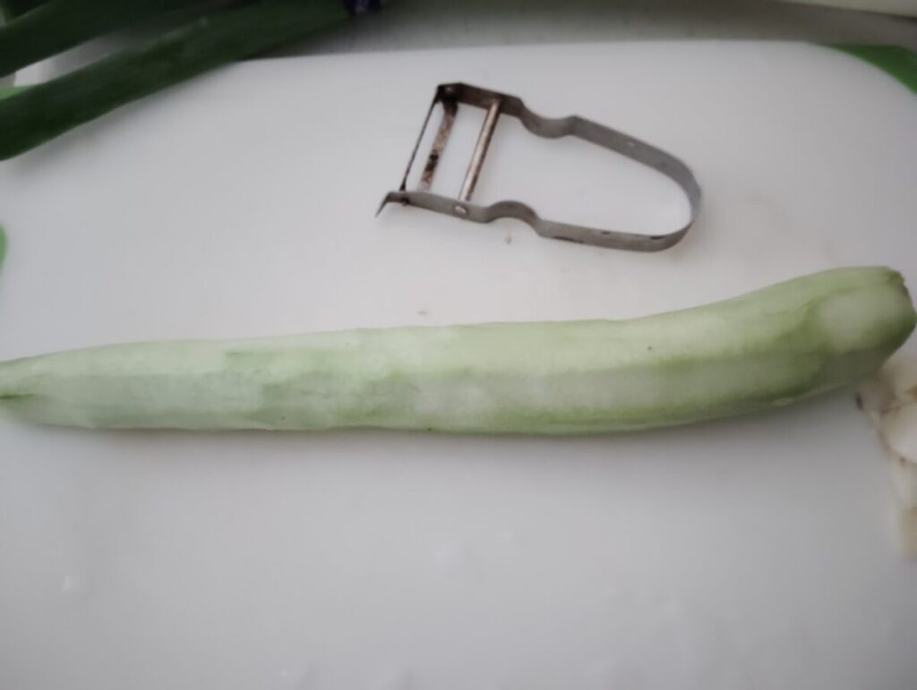 ピーラーで皮をむくと、白肌の中身が見えてきます。たわしのイメージとは全く違う柔肌(笑)でツルツルしています。